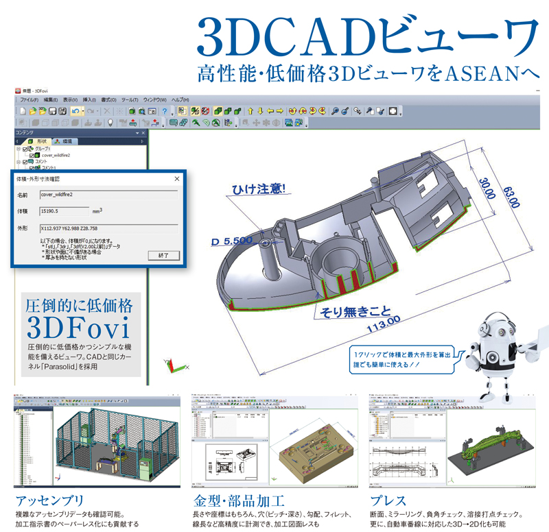 今やあらゆる機械設計の図面作成に用いられるCADだが、中小零細企業や現場担当者が扱うには、高い専門性とコストが壁となる。現場の「より手軽に図面を読み込みたい」というニーズに応えるのが、同社の「3DFovi」だ。オフィス系ソフトのように簡単な操作性でありながら、正確にビューイング・計測ができ、CADの1/5〜1/10ほどのコストで導入できる。