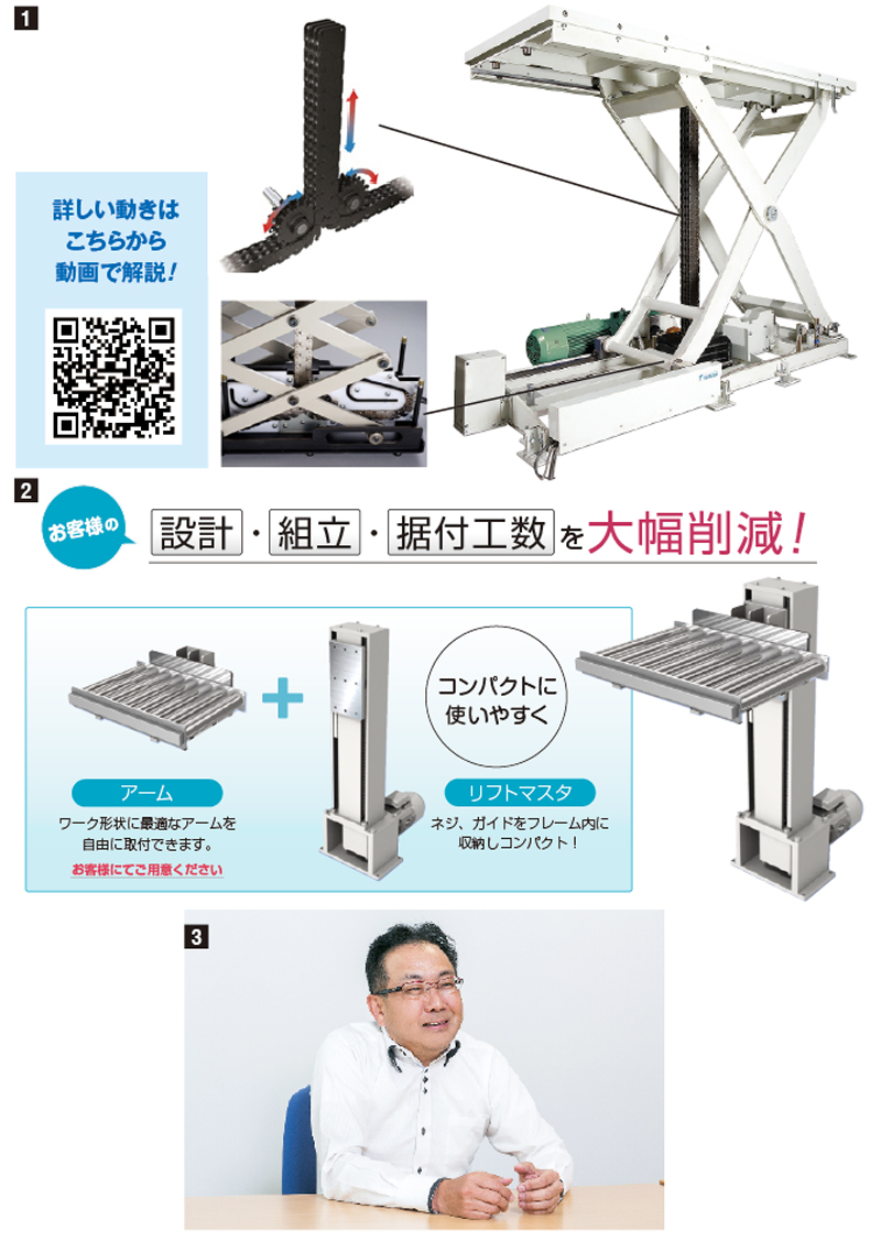 並行して、タイでユニット化した商品展開も進行中。ネジやガイドをフレーム内に収納した電動式リフタ「リフトマスタ」は、片手で楽々持ち運べるコンパクト仕様ながら、アームの自由な取り付けや複数台の連動運転など幅広い用途に対応。油圧式と異なりピットを掘る必要もないので、アーム下のスペース活用など、生産ラインの自由なレイアウトを可能にした。また、駆動部がワーク側面に備えられているのでメンテナンスも安全だ。