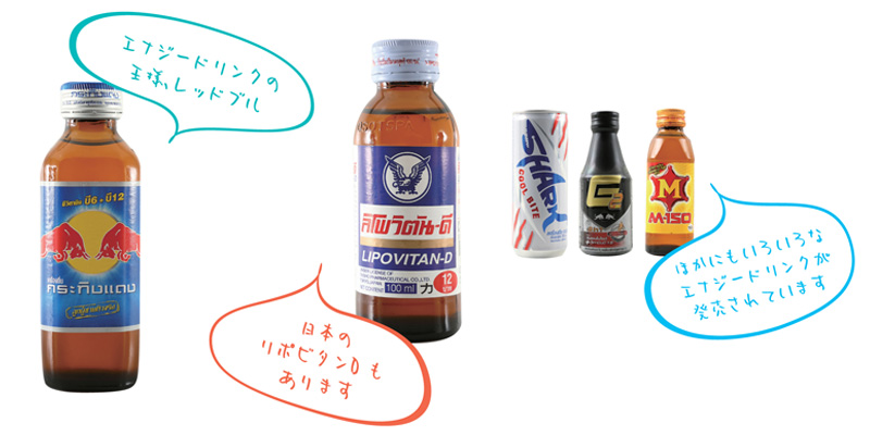 タイのスーパーには、多くのエナジードリンクが置いてあり、その種類は日本にも引けをとりません。しかも、あのエナジードリンク界の王者「レッドブル」は、タイのTC製薬社が製造しているKrating Daengという清涼飲料水をもとに作られたというのは、ご存じでしょうか。ちなみにKrating Daengとはタイ語で“赤いガウル”という意味。ガウルとはウシ亜科の動物だそうです。まさに、“レッドブル”ということですね。