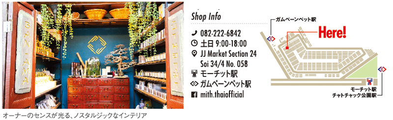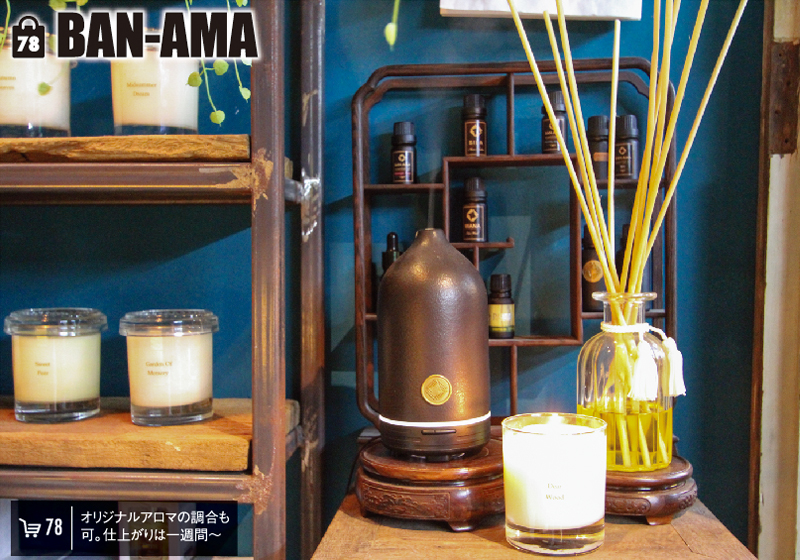 アロマ好きのオーナーが、1年ほど前にオープンしたアロマブランド「Ban-AMa」。 「一般の人達にも手に入れやすい価格で」というオーナーの思いにより、デパートに並ぶディフューザーの半値ほどで購入することができます。“古き良きタイ”をコンセプトにした同店のアロマは、ノスタルジックな香りが特徴で、樹木系、フルーツ系、フローラル系、ハーブ系など24種類の香りに加え、オーナー独自のレシピでブレンドしたスペシャルアロマもあります。ほかにも、20種類の香りを灯りとともに楽しめるソイキャンドルは、溶けた蝋(ろう)を肌に塗るスパグッズとして使うことができます。