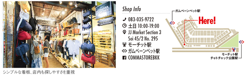 今年9月にオープンしたタイ人ブランド専門のセレクトショップ「Comma Store」。タイ人デザイナーによる約30ブランドを取り扱い、半年に1度のサイクルで新コレクションやブランドを入れ替えるそうです。 商品ライナップは多種多様で、洋服、靴、靴下のほかアクセサリー、腕時計、携帯電話ケースまで揃います。何より、オーナー自らもデザイナーであり、店頭にはキャンバス鞄と靴下の自らのブランドも並べています。スタイルはカジュアルからフォーマルまで揃い、顧客からは「オンラインで買っていたブランドが店頭で見れてうれしい」との声も。次の週末はぜひ足を運んで下さい。