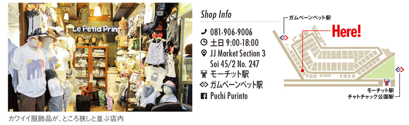 和名店「プチプリント」を掲げているので、日本人経営? と勘違いしそうですが、タイ人オーナーのお店です。「多くの日本人に来てもらいたい」との思いから名付けられました。メインは、可愛らしい動物のキャラクター(100種以上)Tシャツ。ほかにも、ドレスやサロペットもあり、サイズは0〜7歳用から、大人用(男女)まで用意。サイズ違いの同じデザインで揃えれば、家族みんなで楽しむこともできます。素材はコットン100%やリネンといった自然繊維にこだわり、暑いタイでも涼しく子どもの肌にも◎。洋服以外にも帽子、靴、アクセサリーもあり、満足すること間違いなしです。BTSアソーク駅直結のターミナル21にも店舗があります。