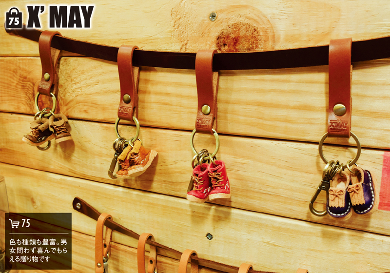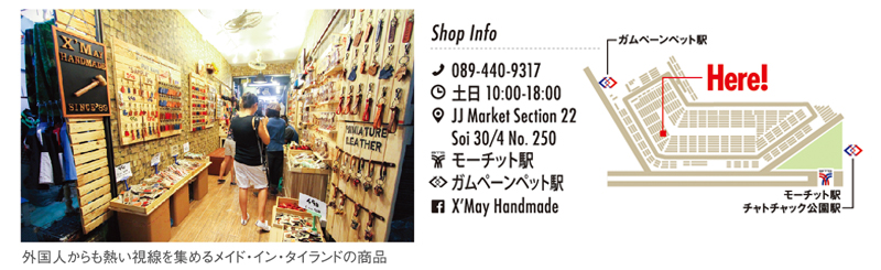 ハンドメイドの革キーホルダー専門店「X’ May」。出店当初は、工場から買った有り合わせの革を接着剤で小さな靴の形に整え、キーホルダーとして販売していましたが、チャトチャック出店に際して本革の靴の製作工程を研究し、ミニチュアながら実寸の物にも引けをとらないクオリティで売り出しました。 現在も一つひとつ丁寧に手作りする姿勢は変わらず、国内外の本革を用いてバッグ型やシンプルなネームプレート、果ては本物の革靴など、多くの革製品を作り出しています。オリジナルのキーホルダーは家族や友人へのお土産にもぴったりで、オーダーメイドにも対応しています。