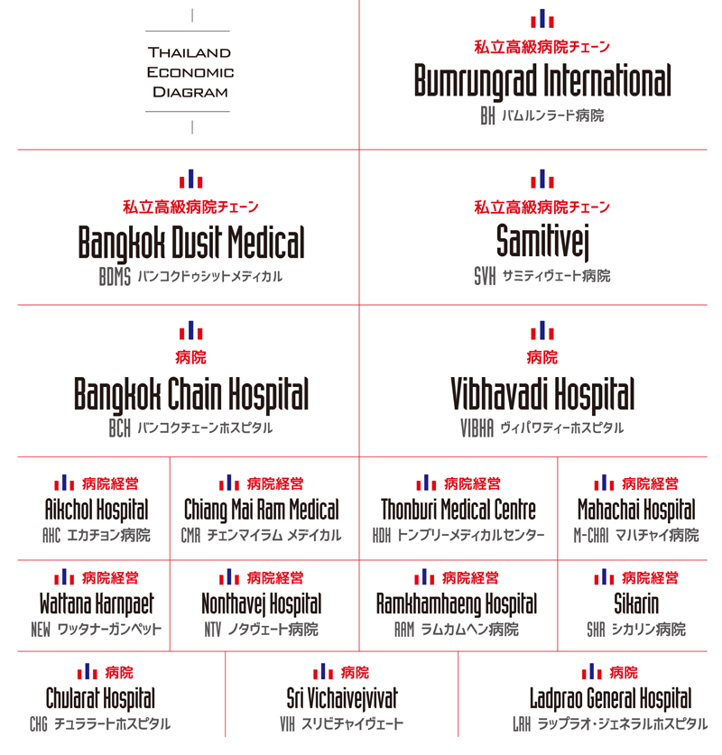 タイ証券取引所に上場している7番目のセクターはサービス分野である。2015年度末時点でサービスの分野は6つに分かれていて商業・小売21社、医療16社、メディア29社、専門サービス3社、旅行12社、輸送19社の合計100社が上場している。今回はヘルスケア関連事業で上場している企業の解説を行う。タイのヘルスケア分野企業では、病院事業系が並ぶ。タイ証券取引所(SET)では病院事業が上場することができる。大手病院グループのバンコク・ドゥシット・メディカルサービスは航空会社のバンコクエアウェイズと同資本の財閥が運営している。タイ最大の医療サービスのネットワークを展開し、サミティヴェート病院、BNH病院、パヤタイ病院なども同グループ傘下の病院であり、タイで人気のリゾート地やカンボジアにも展開している。