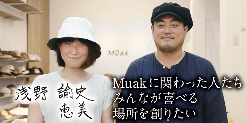 Muak経営者 兼 帽子デザイナー。岩手県・東京都出身。お互い20代の頃にチェンマイの帽子工場で出会い、結婚。工場閉鎖を機に一度は日本へ帰るが、資金を貯め、2011年12月にタイへ移住。日々チェンマイとバンコクを行き来し、韓国や中国、ベトナムなどにも買い付けに奔走する。4歳の娘とともにチェンマイ在住。夫婦円満の秘訣は、引きずらないこと。Muakとは、タイ語で「帽子」の意味。