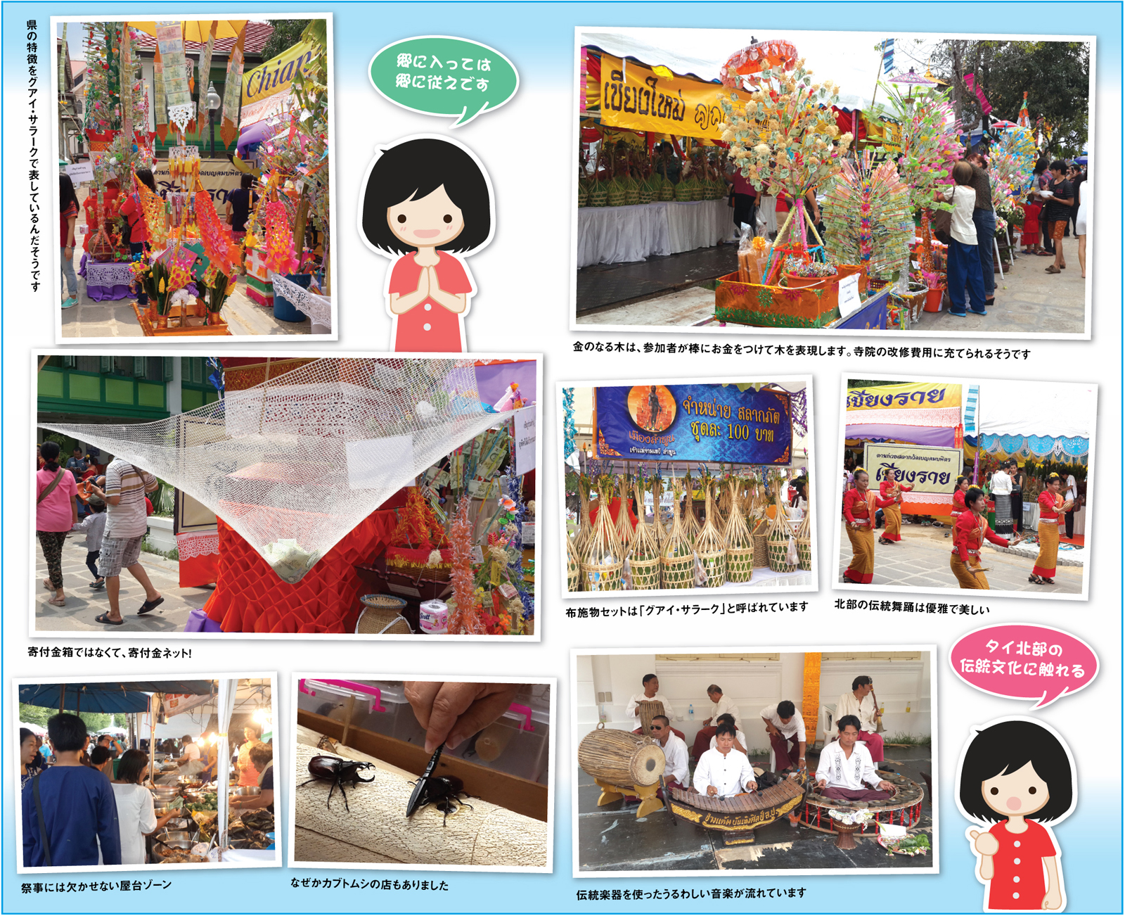 実は、今回の“プンが行く“は、残念ながら北部までは行けず、バンコクにあるベンチャマボピットという寺院の「ターン・グアイ・サラーク」に参加したんです。同寺には、この時期に実家へ戻れなかった北部出身者が多く集まっていました。もちろん、集った僧侶も北部の寺院からわざわざバンコクまで足を運んでくれたそうです。祭事期間中は、チェンマイ、チェンライ、ナーンなどの北部各県にちなんだ出店が並び、北部の生活様式や伝統舞踊などの文化も体験できます。もちろん、お腹が空いたら北部料理の屋台を楽しむことも。徳を積みながら、北部文化に触れられた貴重な経験となりました!
