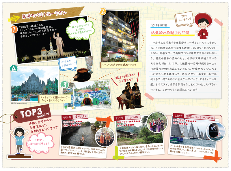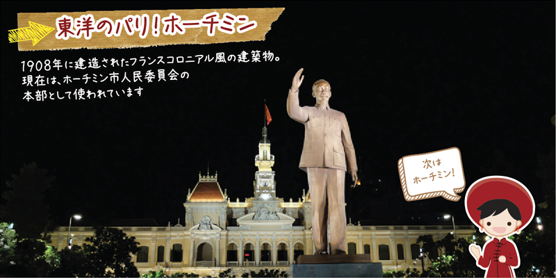 ベトナムを代表する商業都市ホーチミンにやってきました。ここ数年で急激に発展を遂げ、バンコクと変わらないくらい、高層タワーや高級ブランド店が立ち並んでいました。現在は日本の協力のもと、地下鉄工事が進んでいるそうです。街には、フランス植民地の名残が残るヨーロッパ建築の建物も点在していました。時間があったら、ちょっと郊外へ足を延ばして、遊園地から一風変わったワニ釣りまで、何でもありの巨大テーマパーク「スイティエン公園」もオススメ。まだまだ行ったことのないところが多いベトナム。これからもっと開拓したいです!
