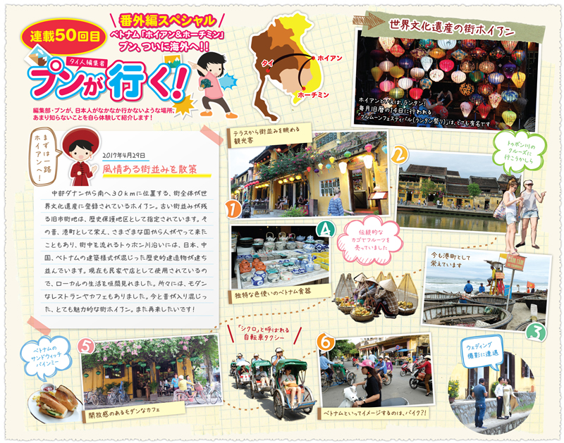 中部ダナンから南へ30kmに位置する、街全体が世界文化遺産に登録されているホイアン。古い街並みが残る旧市街地は、歴史保護地区として指定されています。その昔、港町として栄え、さまざまな国から人がやって来たこともあり、街中を流れるトゥボン川沿いには、日本、中国、ベトナムの建築様式が混じった歴史的建造物が建ち並んでいます。現在も民家や店として使用されているので、ローカルの生活を垣間見れました。所々には、モダンなレストランやカフェもありました。今と昔が入り混じった、とても魅力的な街ホイアン。また再来したいです!