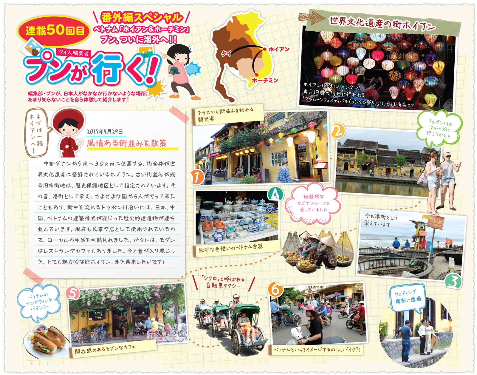 中部ダナンから南へ30kmに位置する、街全体が世界文化遺産に登録されているホイアン。古い街並みが残る旧市街地は、歴史保護地区として指定されています。その昔、港町として栄え、さまざまな国から人がやって来たこともあり、街中を流れるトゥボン川沿いには、日本、中国、ベトナムの建築様式が混じった歴史的建造物が建ち並んでいます。現在も民家や店として使用されているので、ローカルの生活を垣間見れました。所々には、モダンなレストランやカフェもありました。今と昔が入り混じった、とても魅力的な街ホイアン。また再来したいです!