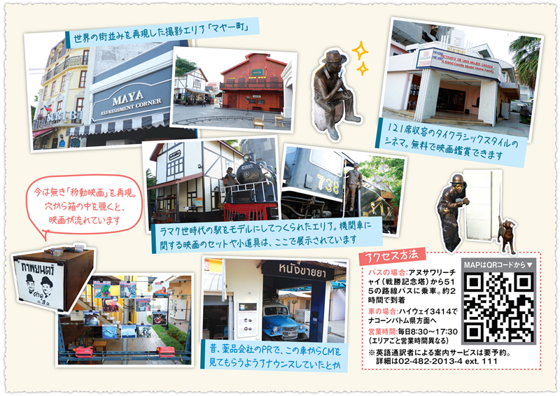 ここは、タイの映像作家によるフィルムを中心に、文化・歴史的価値のある作品を保管するため、1984年にタイ文化省芸術局国立公文書館部によって設立。当初関係者以外は利用できませんでしたが、文化芸術の育成を目的に、97年から一般公開が始まりました。施設内は、歴史的な作品が観られるシネマをはじめ、撮影現場の再現やモニュメントが至るところに点在。タイの昔の町を細部まで再現したエリアでは、まるでタイムスリップしたかのような感覚になりました。平日はオープンしていないエリアもあるので、土日に行くのがオススメです!