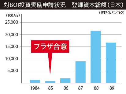 長谷場:前回説明した「合弁に関する基準」に従って、多くの日本企業がタイ企業との合弁という形で進出してきました。さらに、プラザ合意以降はグラフのように一気に日本からの進出が進みました。