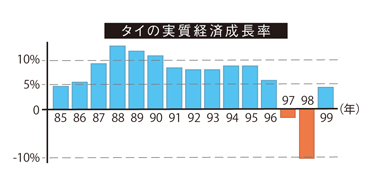長谷場:さて、タイの実質経済成長率はプラザ合意後に日本企業の進出が増えた87年から急激に伸びていきます。非常に好調な時期が続きました。こちらのグラフを見てください。0000
