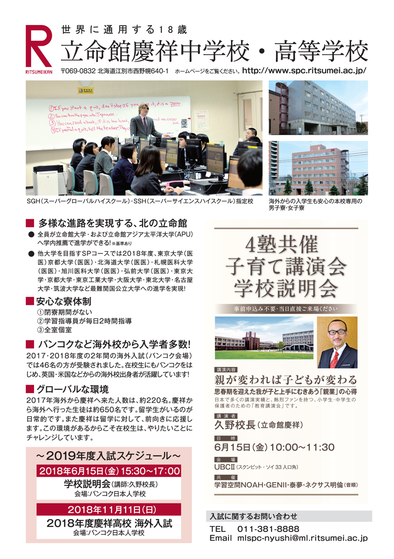 2018.04.17 その他 立命館慶祥 立命館慶祥 HP : www.spc.ritsumei.ac.jp St. Andrews International School Sukhumvit 107 将来的なリーダーを目指せるような創造力あふれる人間を育てていきたい ことびあクリニック 夜22時まで対応可能なオンライン診療や お薬デリバリーも可能! JTBタイランド 旅行、出張、航空券、ホテル、現地のオプショナルツアー…。 調べて、比べて、決めて、手配して―― 旅の準備は意外とやることがたくさん。 ひとりで頑張らなくても大丈夫です。 ぜひ、JTBタイランドにご相談ください。 この記事をSNSでシェア! Tweet Share LINE リンクをコピー