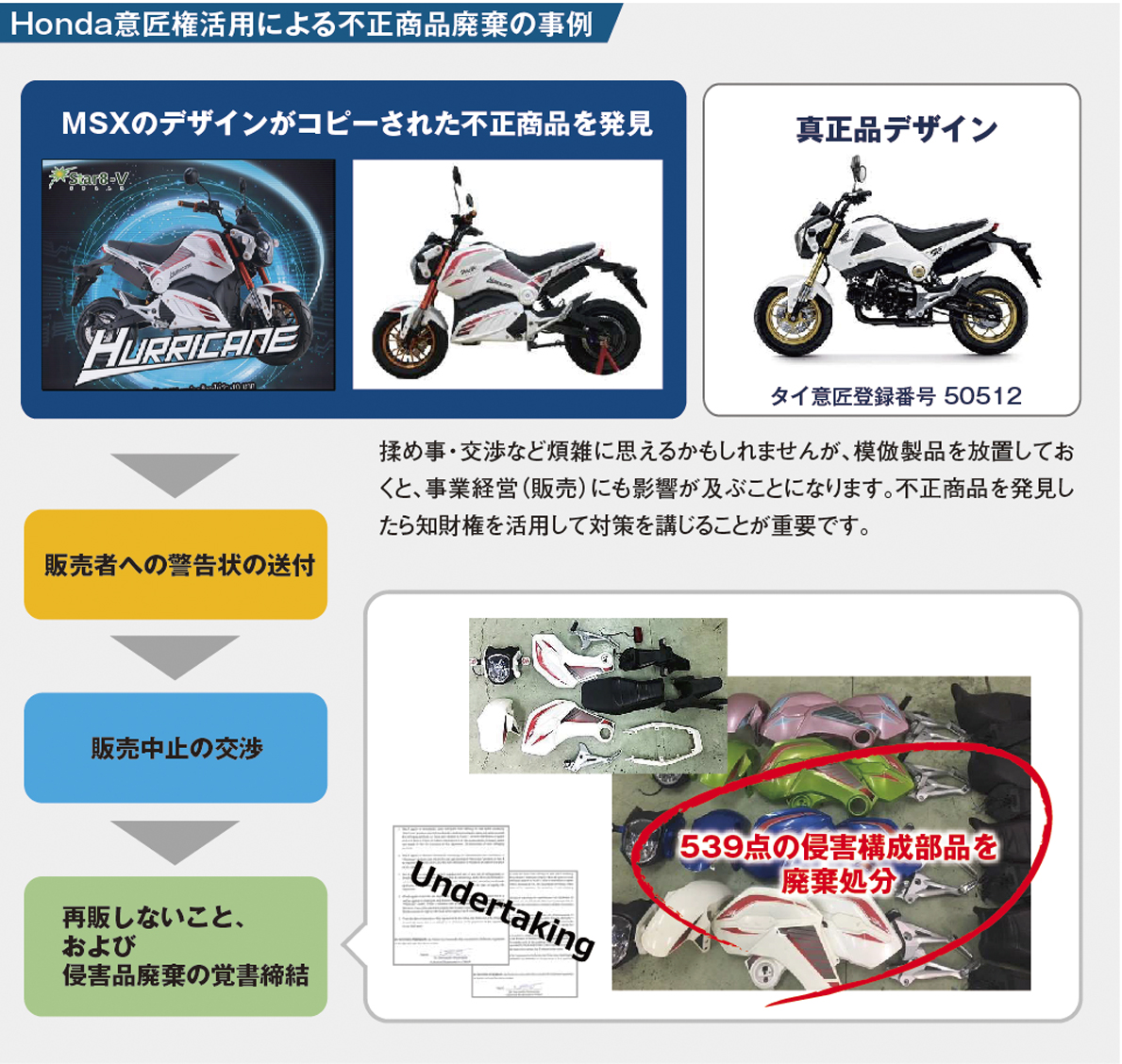 それでも、似たようなデザインのオートバイが低価格で販売されていたことが判明! 意匠権※を活用し、不正商品を廃棄処分させることに成功しました。