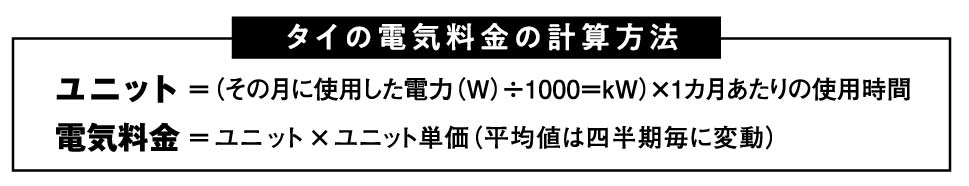 タイの電気料金は「ユニット」という単位で計算され、1ユニットは1kW(キロワット)を1時間使用した場合の電力量を指します。