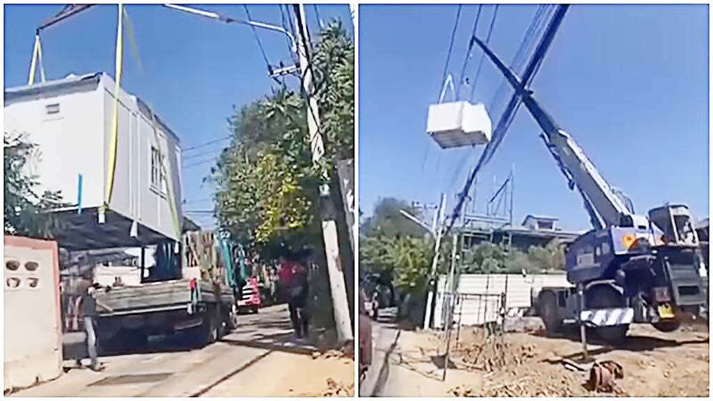 場所はタイ東北部コンケーン県の住宅建設現場。重さ1トン以上あるノックダウン式プレハブハウスの設置作業中にクレーンが倒壊。10m以上の高さまで吊り上げられていたプレハブは隣接する民家の屋根に落下、さらにクレーンも一緒に倒れてしまったのだ。
