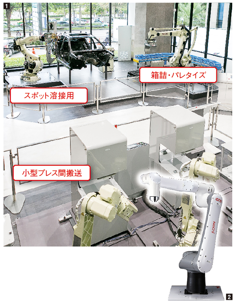 - ①アソークのショールーム兼テクニカルセンターには、自動車組立工場に導入されるスポット溶接用ロボット「SRA210H」、箱詰・パレタイズ「LP180」、小型プレス間搬送「MC20」、研磨・バリ取りセル「EZ07」などをはじめ、試作品を作るテスト機も配備。「実際に間近で見ることで、スピード感を感じて頂けます」と寳島VP