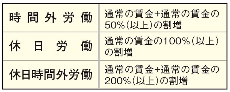 長谷場:残業(時間外労働)、休日労働、休日時間外労働の賃金割合は表のように定められています。