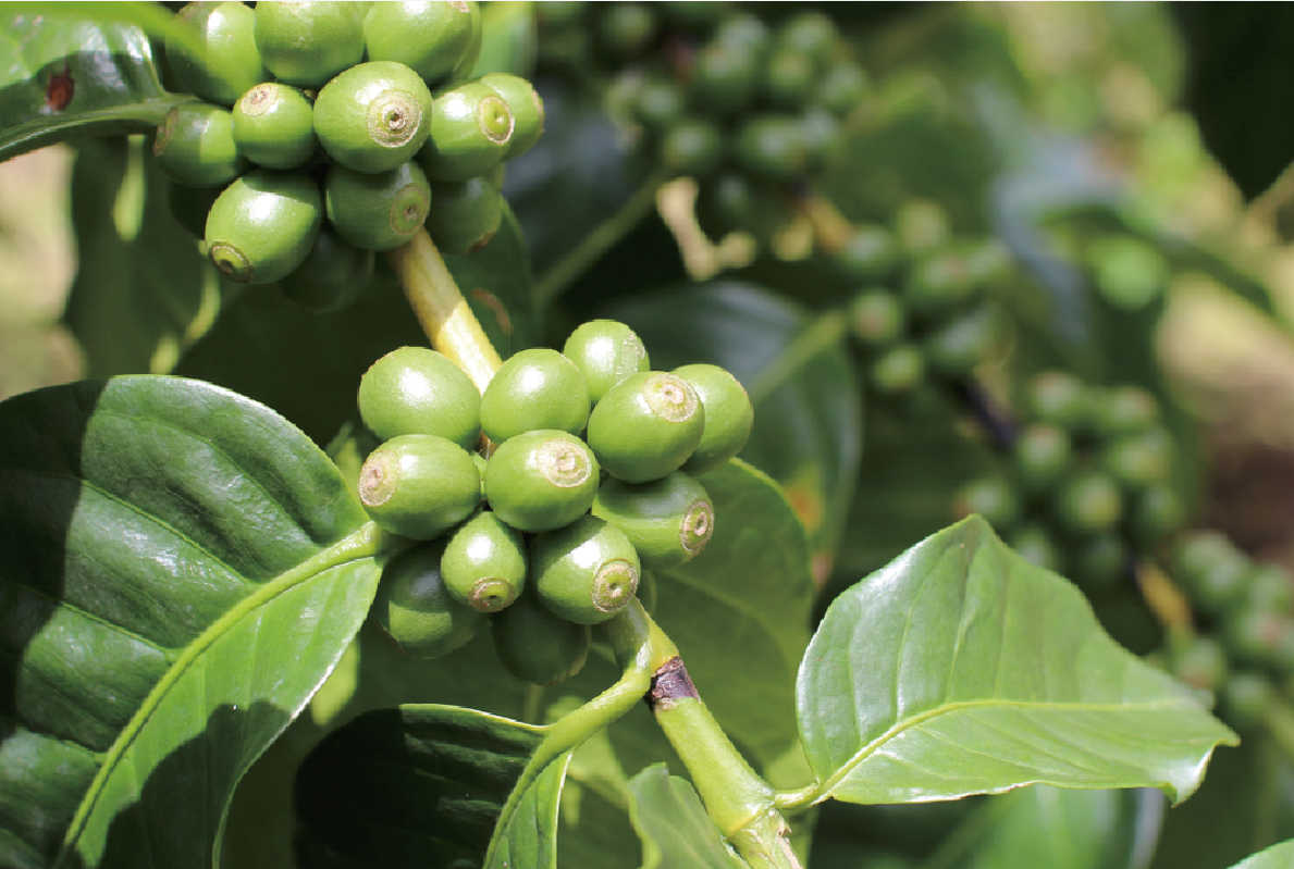 農園で見たコーヒーの実。取材時はまだ青く、今から赤く色づいていくそう(10月末〜1月頃が収穫期)