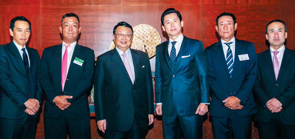 左から、OKB 吉成広行取締役(海外事業推進部長)、臼井氏、土屋頭取、週刊ワイズ西岡CEO、SPM(ワイズグループ)藤井啓之代表(WiSE & OK/取締役副 社長就任予定)、OKB後藤勝利取締役(人事部長)