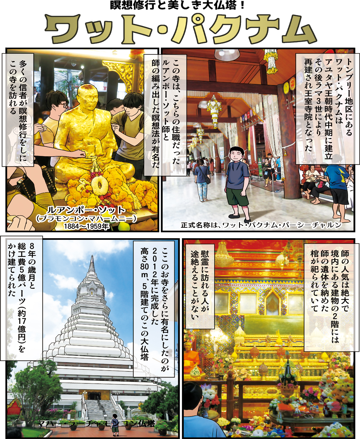 2019.03.26 「漫画で学ぶ」タイのお寺 ワット・パクナム「瞑想修行と美しき大仏塔!」 WAT PAK NAM 【場所】「トンブリーエリア」 【交通】BTSタラートプルー駅からタクシーで約8分 【時間】24時間 (マハー・ラーチャモンコン仏塔は8:00〜18:00) 【入場料】無料 【備考】露出した服装はNG DYMクリニック 2024-2025年用インフルエンザワクチンの取り扱い開始 タイでは1年を通してインフルエンザに感染する可能性があるため、ワクチンの接種が推奨されている。DYM… スターツ タイランド 世界21ヶ国34拠点 海外不動産のリーディングカンパニー スターツ リリースから半年で登録者600名突破! タイ転職の新たな常識『タイスカウト』が、 求職者と企業に選ばれる3つの理由 2025年5月2日にリリースしてから半年が過ぎた。タイスカウトは、単なる転職サイトの一つに留まらず、… 「CloudRoom」でバンコク生活の収納問題解決へ スマホで収納!スマホで取り出し!ライフステージの変化などによって日に日に増えていく生活の身の回り品。… この記事をSNSでシェア! Tweet Share LINE リンクをコピー