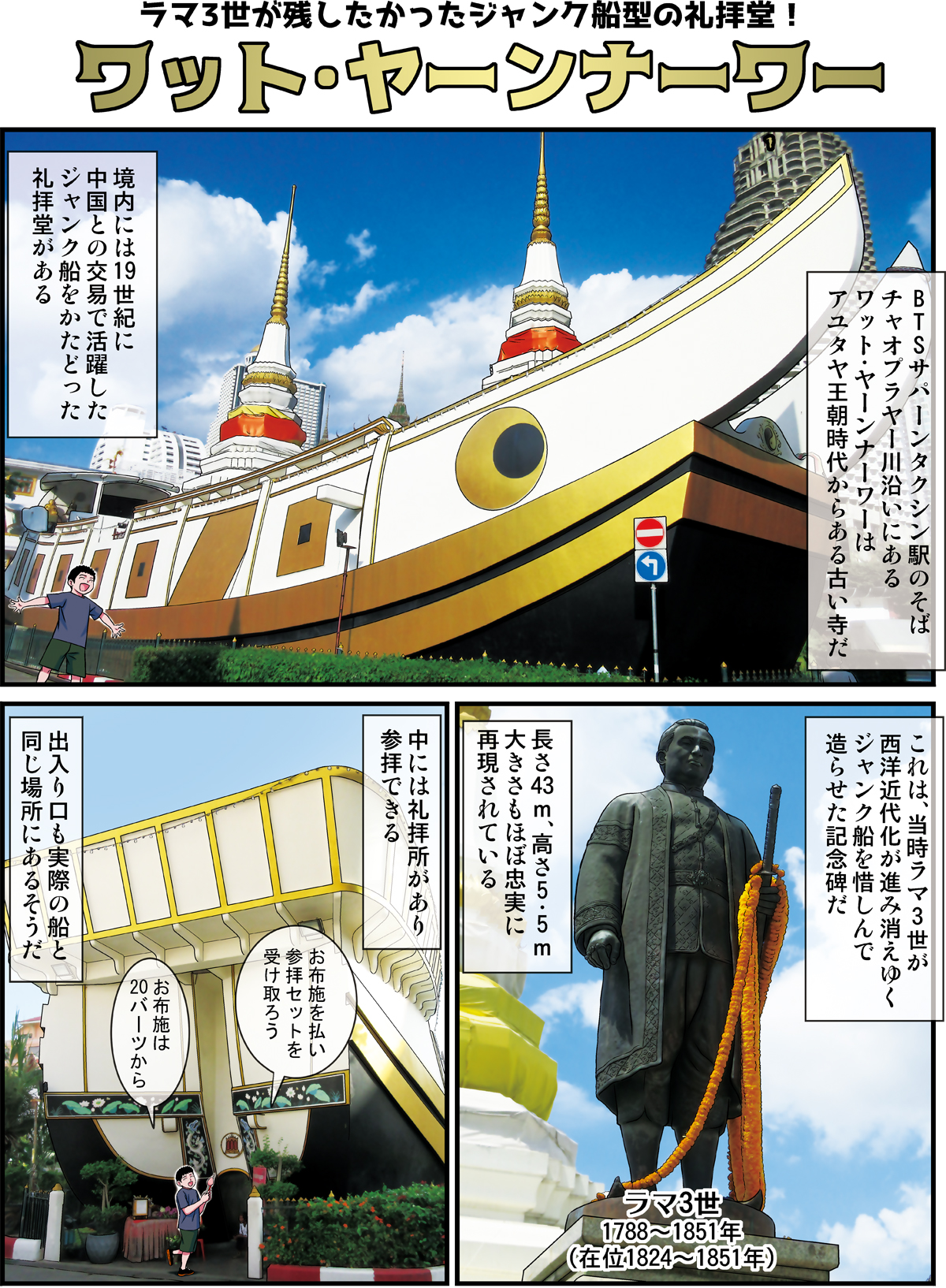 2019.04.1 「漫画で学ぶ」タイのお寺 ワット・ヤーンナーワー「ラマ3世が残したかったジャンク船型の礼拝堂!」 WAT YANNAWA 【場所】「サパーンタクシン周辺」 【交通】BTSサパーンタクシン駅から徒歩3分 【時間】毎日5:00〜22:00 【入場料】無料 【備考】露出した服装はNG St. Andrews International School Sukhumvit 107 将来的なリーダーを目指せるような創造力あふれる人間を育てていきたい 「MITSUKOSHI DEPACHIKA」新年ギフトセット「GIFT FROM THE HEART」を発売 2026年の新春を彩る、日本スタイルのお歳暮・お年賀コレクション 「MITSUKOSHI DEPACHIKA」“心からの贈り物”という日本の贈る文化の精神を込めた新年… タイで働く日本人に特化した スカウト転職サイト「タイスカウト」 サービス開始!(完全無料) 株式会社サンクアジアは5月2日、日タイ転職に特化したスカウト型の転職サイト「Thai Scout(タ… この記事をSNSでシェア! Tweet Share LINE リンクをコピー