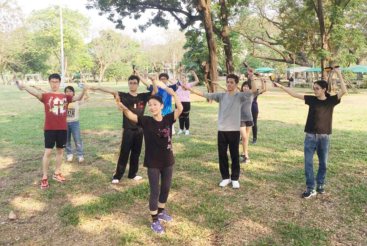 青空のもと、ルンピニ公園で練習に励む久保さんと泰日工業大学の学生たち