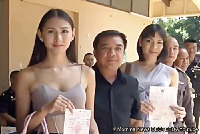 1日、中部ピッサヌローク県の検査会場には、トランスジェンダーコンテスト優勝者のパーヌポンさんが伝統衣装姿で登場。