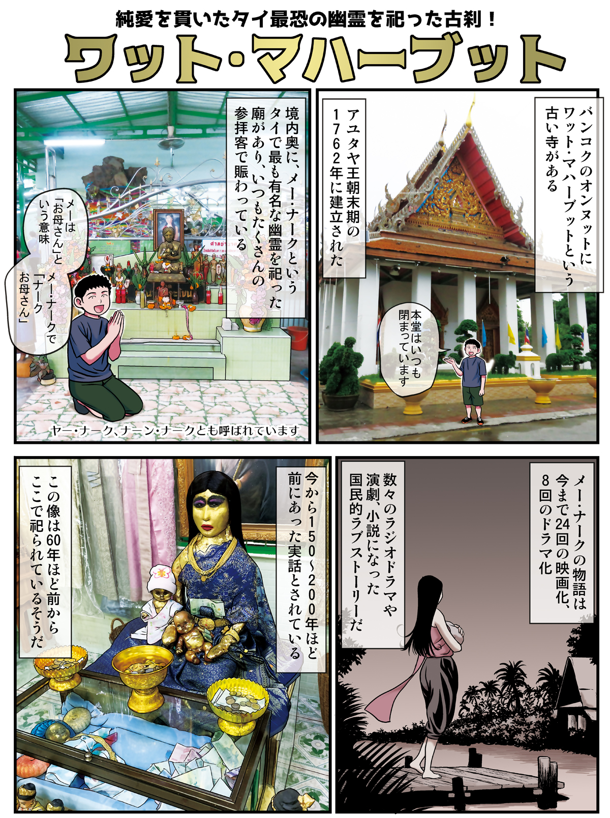 2019.05.2 「漫画で学ぶ」タイのお寺 ワット・マハーブット「純愛を貫いたタイ最恐の幽霊を記った古刹!」 WAT MAHABUT 【場所】「オンヌット」 【交通】BTSオンヌット駅からタクシーで約10分 【時間】毎日7:00〜17:30 【入場料】無料 【備考】露出した服装はNG。 本堂等、一部撮影禁止。 St. Andrews International School Sukhumvit 107 将来的なリーダーを目指せるような創造力あふれる人間を育てていきたい ことびあクリニック 夜22時まで対応可能なオンライン診療や お薬デリバリーも可能! スターツ タイランド 世界21ヶ国34拠点 海外不動産のリーディングカンパニー スターツ この記事をSNSでシェア! Tweet Share LINE リンクをコピー
