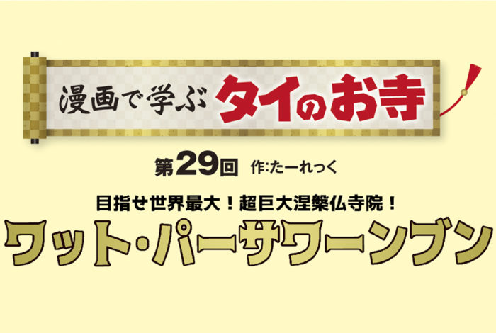 2019.07.22 「漫画で学ぶ」タイのお寺 ワット・パーサワーンブン「目指せ世界最大!超巨大涅槃仏寺院!」 WAT PA SAWANG BUN 【場所】「サラブリー県」 【交通】サラブリーのバスターミナルからタクシーで40分 【時間】毎日8:00〜17:00 【入場料】無料 THAI SCOUT(タイスカウト)登録するだけでタイ転職の可能性が拡がる タイスカウトは、タイ(バンコクおよびその周辺)で働きたい日本人、日本語堪能なタイ人を対象にしたスカウト型転職サービスです。 第23回 ANA寄席2026 in バンコク 【出演:立川志の輔 / 五代目 江戸家猫八 他】 2026年2月28日(土)14:00開演 第23回 ANA寄席2026 in バンコク出演者立川志の輔 / 五代目 江戸家猫八 他開催日20… St. Andrews International School Sukhumvit 107 将来的なリーダーを目指せるような創造力あふれる人間を育てていきたい この記事をSNSでシェア! Tweet Share LINE リンクをコピー