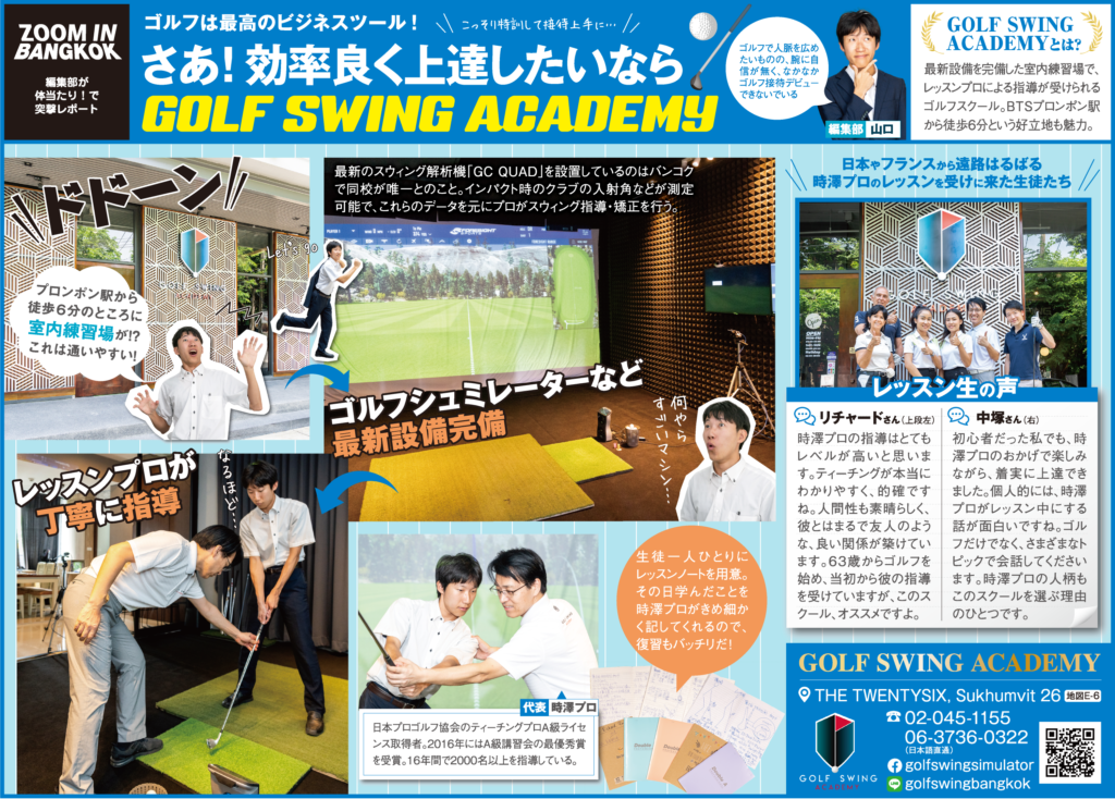 2019.09.9 ZOOM in BANGKOK GOLF SWING ACADEMYとは? 最新設備を完備した室内練習場で、レッスンプロによる指導が受けられるゴルフスクール。 BTSプロンポン駅から徒歩6分という好立地も魅力。 拡大して見る場合は、「新しいタブ」で開いて下さい GOLF SWING ACADEMY Tel:02-045-1155、06-3736-0322(日本語直通) Address:THE TWENTYSIX, Sukhumvit 26 Facebook:https://www.facebook.com/golfswingsimulator Line:golfswingbangkok この記事をSNSでシェア! Tweet Share LINE リンクをコピー