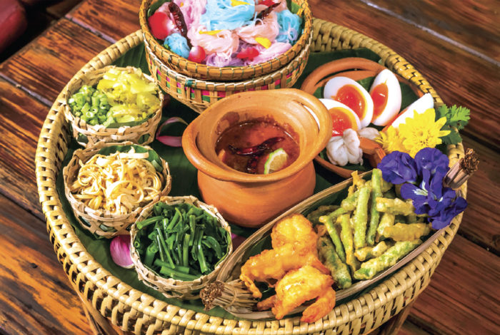 東部チャンタブリー県から、祖母直伝のレシピを引っさげてバンコクへ進出。花びら入り生春巻き「ロールブッサバー」など、目と舌で楽しめるタイ料理を提供しています。イチオシは、子どもの頃におばあちゃんがよく作ってくれた甘口カレー「ナムプリック」や、カラフルなタイ風そうめん「カノムジーン」のスペシャルセット。どこか懐かしい味わいで、上記や野菜は自由にお代わりできますよ。