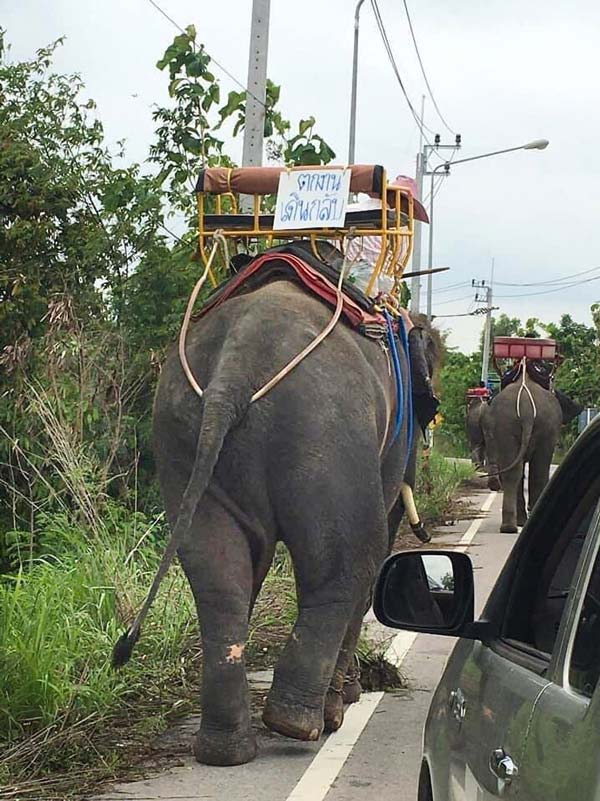 写真はスリン県を目指し500kmもの行程を歩く姿。ゾウには「仕事を失って歩いて帰る」というメッセージも。ゾウの福祉財団により、途中からトラックに乗せて帰ることになったという。