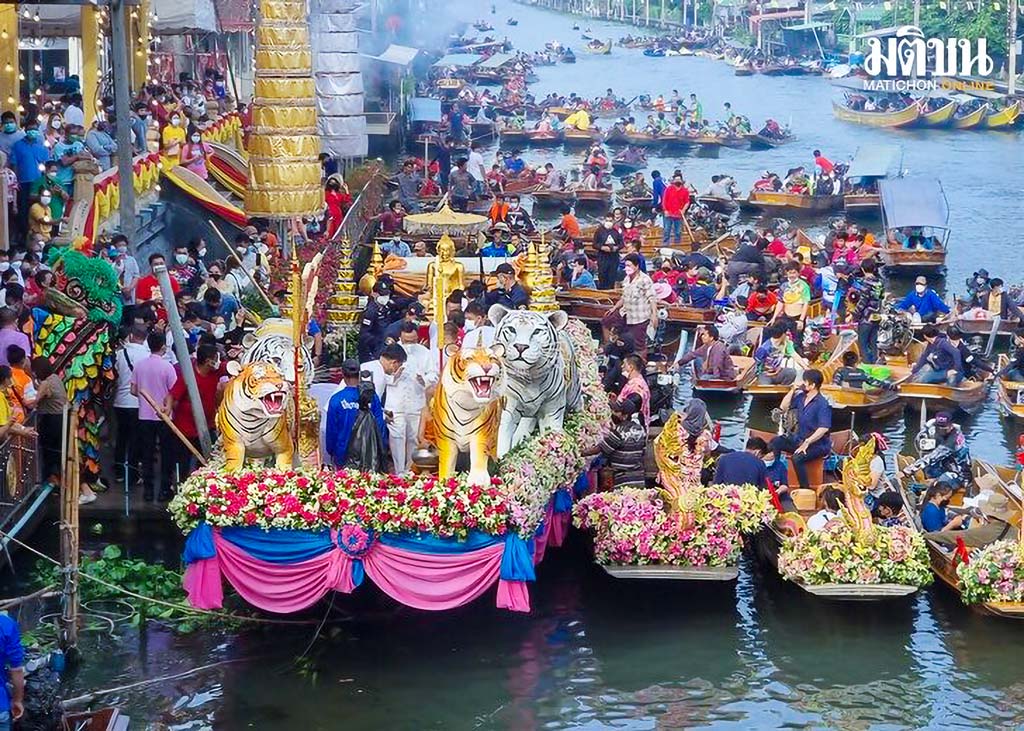 中部サムットサーコーン県バンペオ市のワット・ラクシー寺院で20日、恒例の大仏水上崇拝式が行われた。寺院近くのダムヌンサドゥアク運河には水上の景観に彩りを与えた50以上の舟が浮かんだという。(写真:マティション)