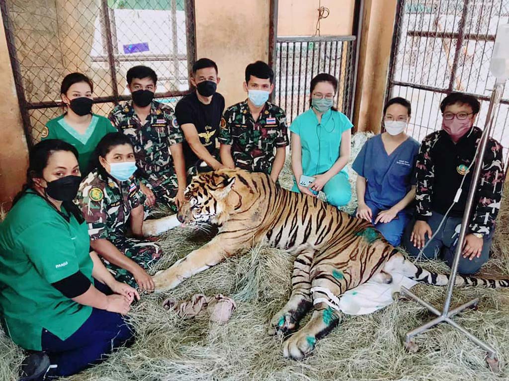 中部スパンブリー県ブンチャワーク野生動物開発管理センターで18日、老齢のため自力で立てないトラに鍼灸と電気理学療法を試みた。代替療法としてリハビリとともに治療を継続するという。(写真:DNP1362@Facebook)