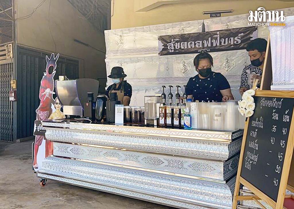 南部スラーターニー県で棺桶業者がカフェをオープンして話題に。「スーキットコーヒーバー(死ぬほど美味しいコーヒーバー)」という店名で、店内には棺桶のカウンターが置かれ、供花などが飾られている。(写真:マティション)