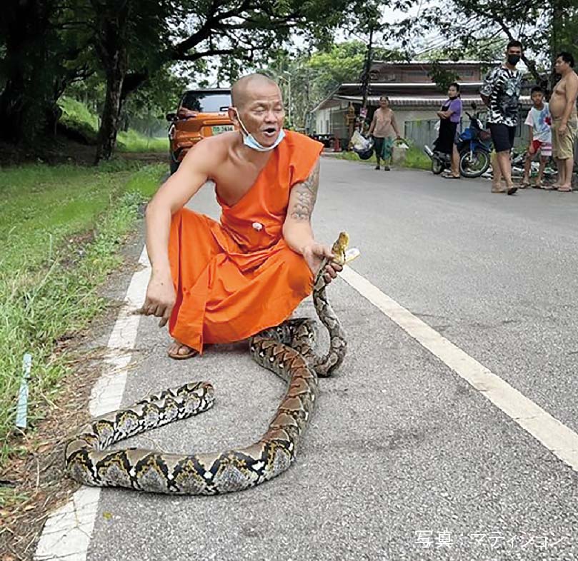 中部ガムペーンペット県で17日、僧侶が住民の依頼を受けて全長3.5mのアミメニシキヘビを素手で捕獲し、居住エリアから10kmほど離れた森に返した。僧侶によると、「いつもこのように自分で対処しているから問題無い」という。