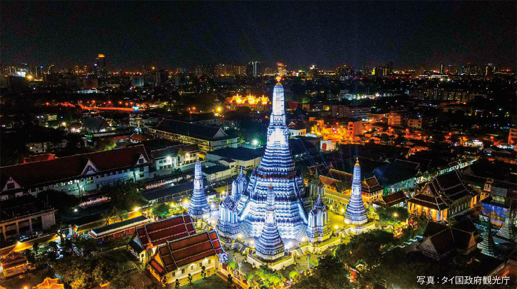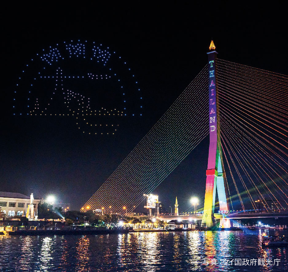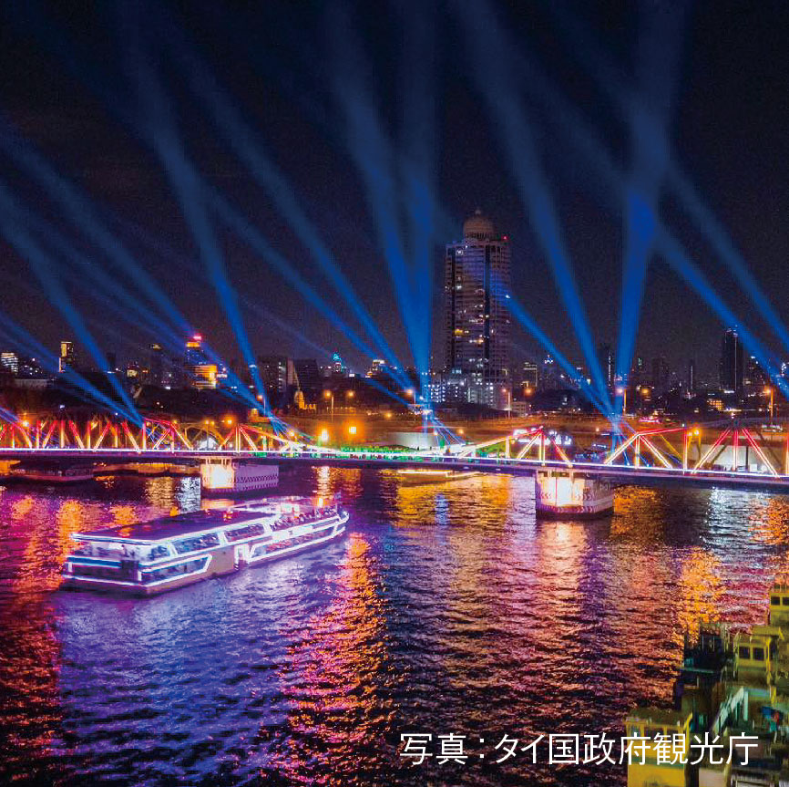 タイ国政府観光庁が主催する光のイベント「Vijit Chao Phraya 2023」が12月31日まで開催中。ラマ8世橋、ワット・アルン、リバーシティ・バンコクなど、チャオプラヤー川沿いの名所が年末までライトアップされる。
