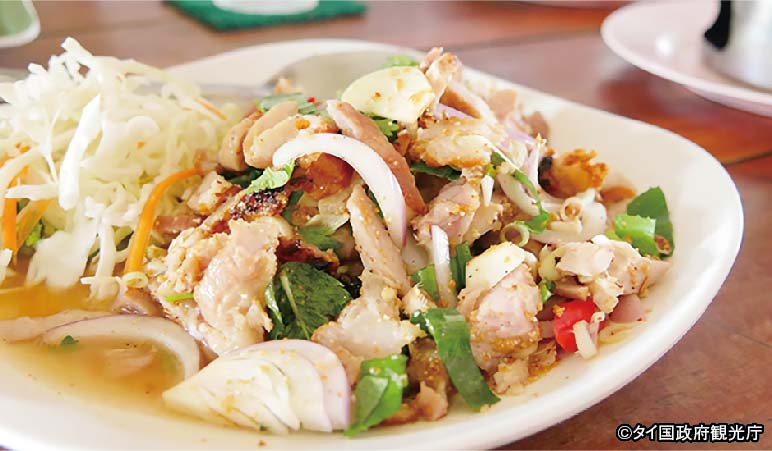 縁起の良い食べ物として有名なのが「ラープ」と「トーン」。東北部料理のラープ(細かく刻んだ肉類をハーブや調味料で味付けした料理)は「金運・宝物」という意味のラープと同じ発音であることから、金運を上げる食べ物だと信じられています。