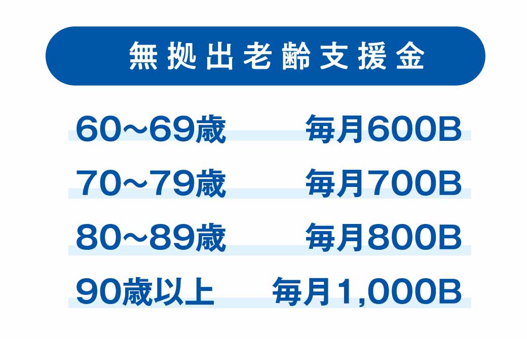 今後の課題の一つとされているのが「高齢化社会」。カシコンリサーチセンターによると、2029年にはタイの60歳以上の人口は約1,800万人に増加すると予測されています(タイの総人口は約6,600万人)。現在は60歳以上の高齢者を対象とした国が支給する「無拠出老齢支援金」がありますが、最低限の生活を維持するためには決して十分とはいえない金額です。タイでは高齢者に向けた取り組みが少しずつ進められています。