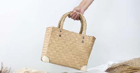 南部スラーターニー県の特産品。タイ南部の沼地に生息する水草「カチュー」から作ったかごバッグは軽くて丈夫。日本人にも人気の商品。