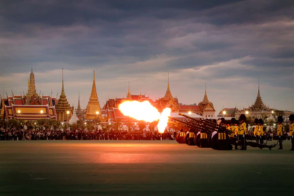 タイ王国陸軍が10月26日、王宮前広場(サナームルアン)でシリキット王太后陛下を追悼する、21発の弔砲があげられた。当日の王宮前広場や周辺には王太后を偲ぶ国民らが続々と集まり、弔砲の様子を静かに見守っていた。