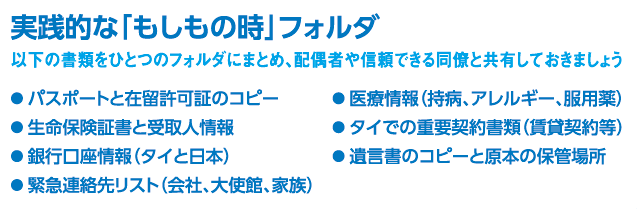 タイでの生活にも慣れて、日常が当たり前になってくるとついつい「海外に住んでいる」ということを忘れがちになります。あまり考えたくはないかもしれませんが、「もしもの時」の備えできていますか?きちんとできていない場合は家族や会社に多大な負担を残してしまうかもしれません。
