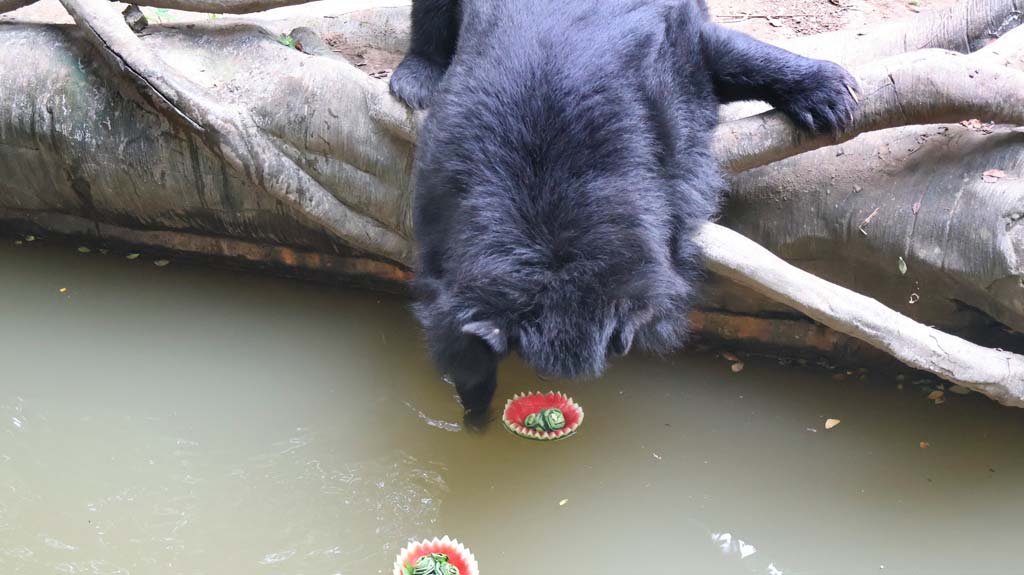 コンケーン動物園ではロイクラトンを記念し、クラトン型の餌が登場。クラトンをイメージした器に餌を乗せ、動物たちに与えられた。動物への環境エンリッチメントの一環として実施され、水場にぷかぷかと浮くクラトンの餌はロイクラトンさながら。写真はツキノワグマの様子。