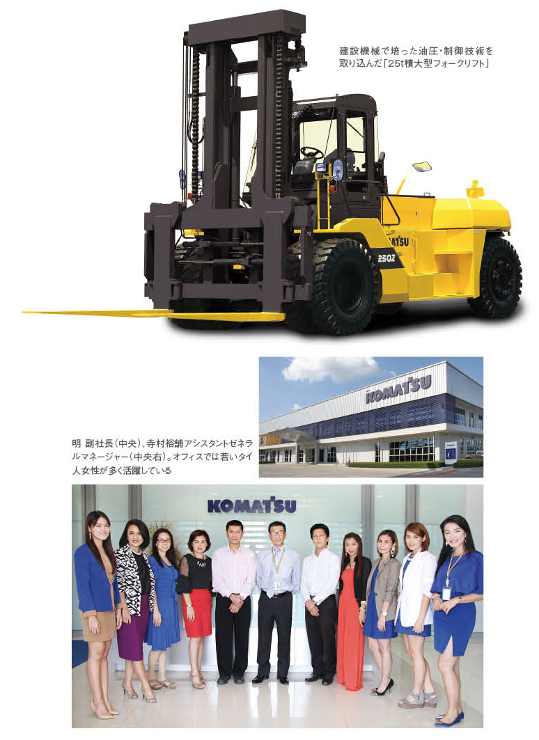 建設機械業界の世界第2位「コマツ」がタイに進出したのは1956年。当初フォークリフトはコマツ建機代理店の産業車両部門としてスタートし、1959年にタイ向けの輸入を開始した。2011年4月にフォークリフト部門を独立させ「バンコク・コマツ・フォークリフト」を設立。一方、同年コマツはフォークリフトの開発・生産を統合。建機の油圧・電子制御技術を取り入れるなど、技術革新に本腰を入れ始めた。革新の成果は、新機種「FHシリーズ」で発揮された。新開発の油圧駆動式トランスミッション「電子制御HST」、油圧システム「可変ポンプCLSS」など、コマツの最新鋭テクノロジーが注ぎ込まれた。結果、同社の従来機種に比べて燃費を最大3割低減させたほか、建機で導入している稼動管理システム「KOMTRAX(コムトラックス)」を標準搭載。作業状況や燃料消費量などをリアルタイムで「見える化」し、生産性が向上した。たゆまぬ技術革新の一方、販売先に対するソフト面でのサービス拡充を進めている。月150人以上の運転技能講習の受け入れ実績がある中で、コマツはタイ進出60周年を迎える2016年、バンコク郊外にトレーニングセンターをオープンする予定だ。「タイにはフォークリフトの免許がないため、運転技術や安全がおろそかになり、作業現場での重大事故につながりやすいのが現状です。トレーニング設備を作り、運転技術を伝えることはお客様へ安全を還元することになると思っています」と明 真佐志副社長は語る。タイでの60年に及ぶ経験と実績をもとに、グローバル企業「コマツ」は確かな製品と、安全を顧客に提供し続ける。