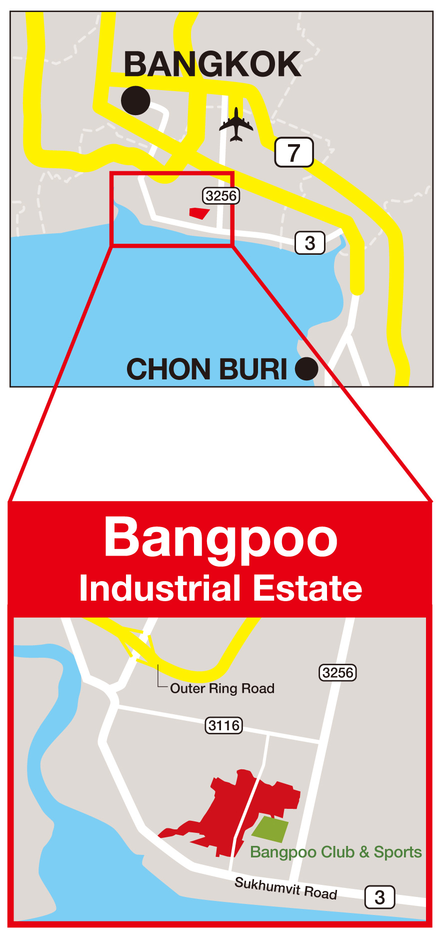 バンコクからおよそ37km、タイ中部サムットプラーカーン県ムアンサムットプラーカーン郡に位置する「バンプー工業団地」。金属産業、電気機器産業、印刷産業などを中心に、さまざまな企業が入居しています。総合的なインフラが整えられているほか、2011年からは同工業団地内でコジェネレーション発電事業も開始。工業団地内に電気と蒸気を供給しつつ、タイ発電公社への売電なども行われています。