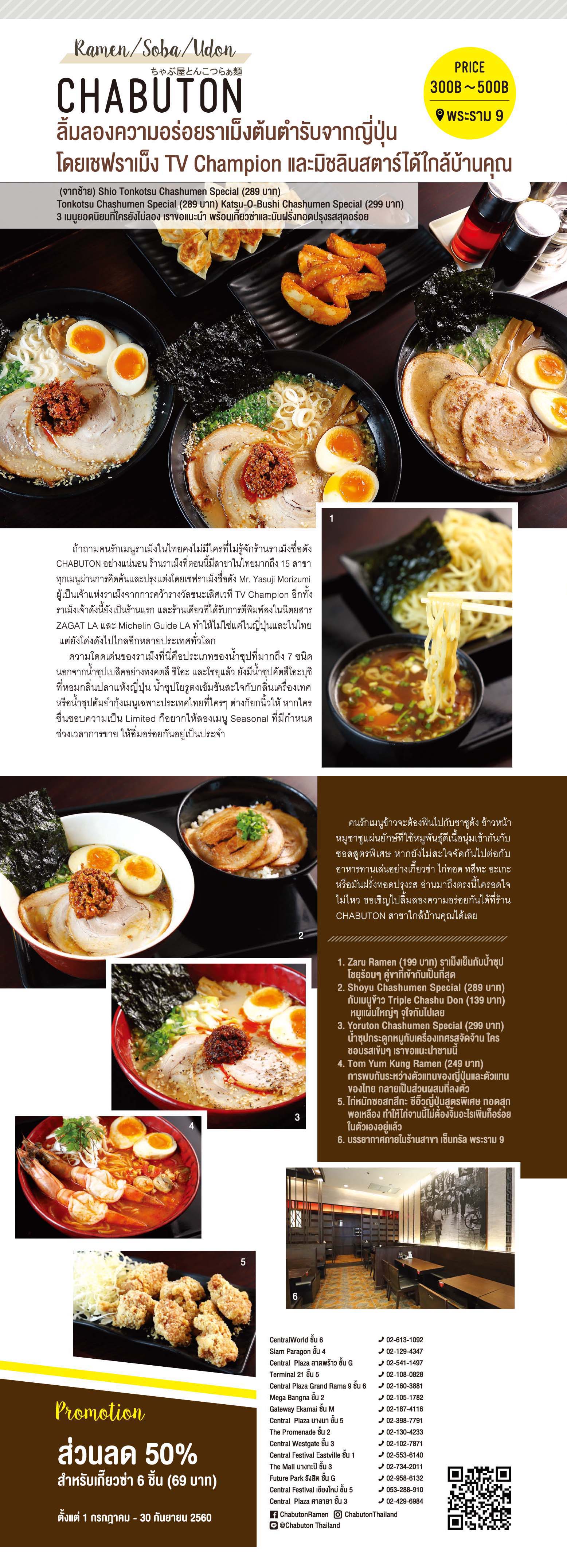 ถ้าถามคนรักเมนูราเม็งในไทยคงไม่มีใครที่ไม่รู้จักร้านราเม็งชื่อดัง CHABUTON อย่างแน่นอน ร้านราเม็งที่ตอนนี้มีสาขาในไทยมากถึง 15 สาขา ทุกเมนูผ่านการคิดค้นและปรุงแต่งโดยเชฟราเม็งชื่อดัง Mr. Yasuji Morizumi ผู้เป็นเจ้าแห่งราเม็งจากการคว้ารางวัลชนะเลิศเวที TV Champion อีกทั้งราเม็งเจ้าดังนี้ยังเป็นร้านแรก และร้านเดียวที่ได้รับการตีพิมพ์ลงในนิตยสาร ZAGAT LA และ Michelin Guide LA ทำให้ไม่ใช่แค่ในญี่ปุ่นและในไทย แต่ยังโด่งดังไปไกลอีกหลายประเทศทั่วโลก