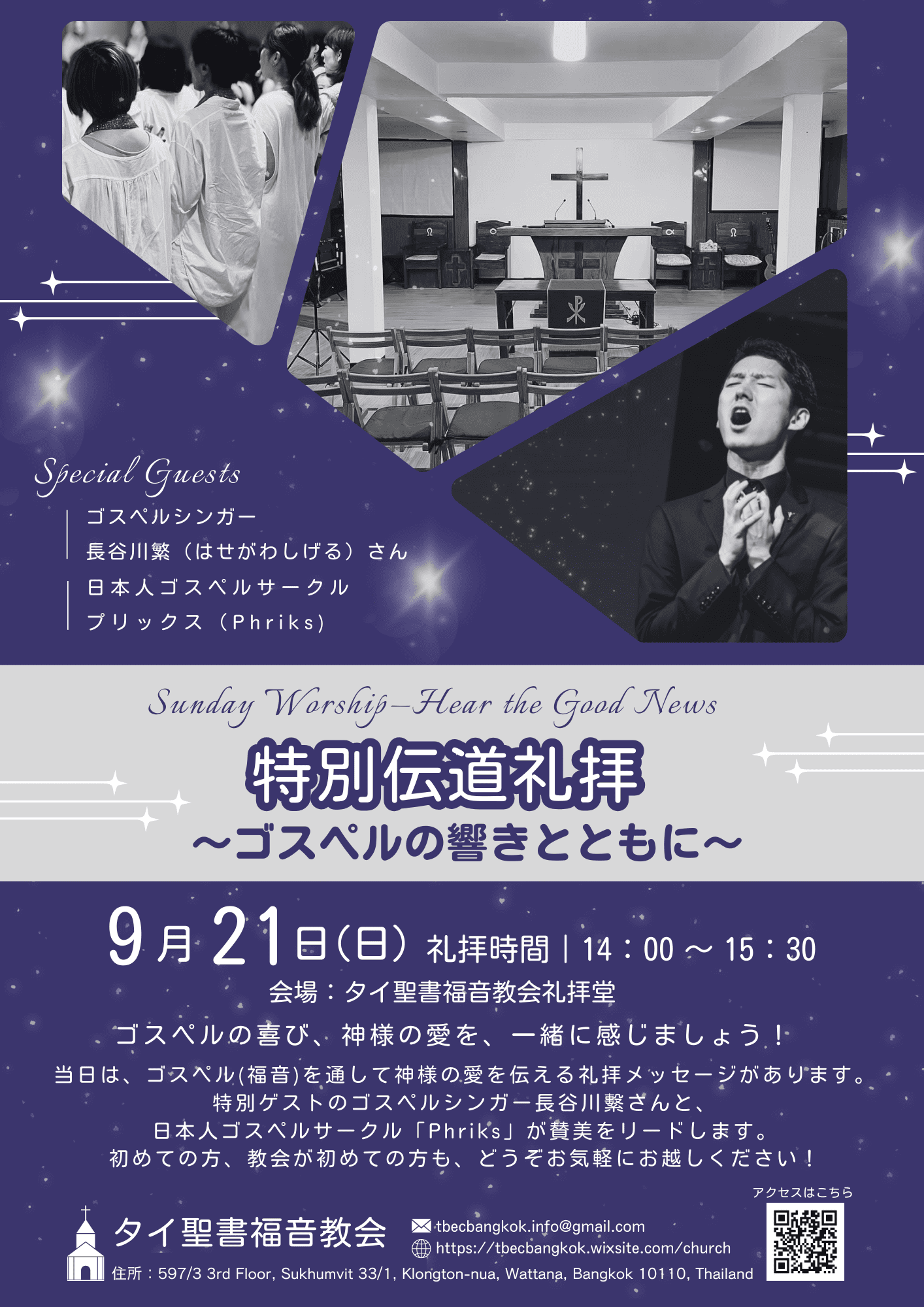 タイ聖書福音教会では、どなたでも参加できる特別伝道礼拝を行います。「特別ゴスペル礼拝」として、ゴスペルを通してより親しみやすく礼拝を体験していただけます。
