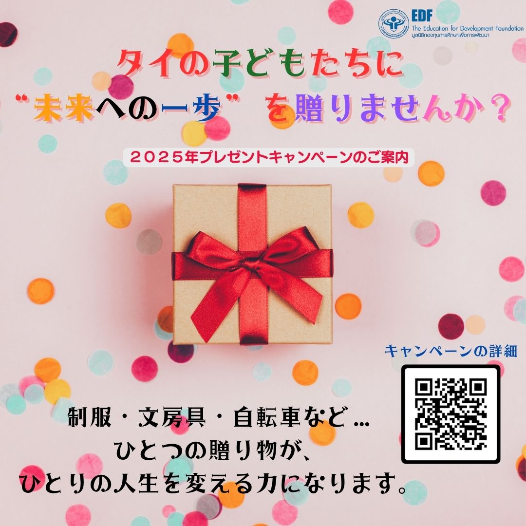 EDFタイ(ダルニー奨学金)は今年もタイの生徒のためのクリスマス・お正月の期間にプレゼント販売をしております。今回のプレゼントセットは学校用靴、文房具セット制服、自転車と任意の奨学金で5種類があります。