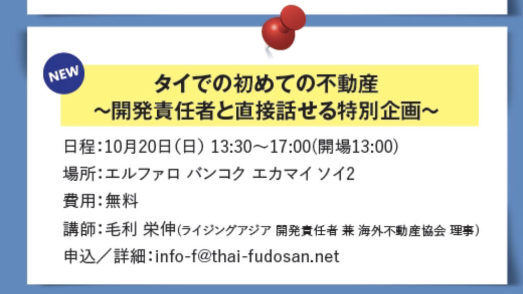 広告掲載料金についてはこちら 2019.10.3 セミナー タイで初めての不動産〜開発責任者と直接話せる特別企画〜 来たる10月20日(日)にエカマイにて不動産セミナー開催!13:00開場の13:30スタートで、約1時間の分かりやすいセミナーの後、パタヤのデベロッパーと直接話せる個別のカウンセリング時間もご用意してます! Tel 0990029397 E-mail info-f@thai-fudosan.net URL thai-fudosan.net/ 投稿者 Midorin Co., Ltd. 誌面掲載 有